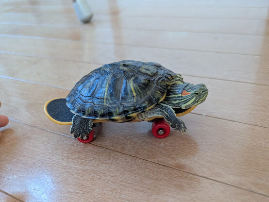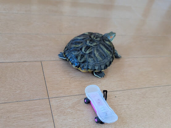 そこで見つけてしまったんです。 可愛い亀さんが、スイスイ〜っとおもちゃのスケボーを乗りこなしている動画を……!